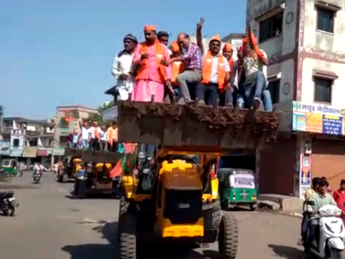 ભાજપના કાર્યકરોનો JCB પર જોખમી સ્ટંટ સાથે ચૂંટણી પ્રચાર