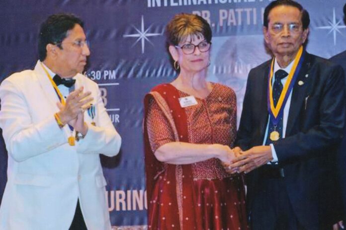 ફોટામાં ડૉ. પટ્ટી હીલ ધીરેશભાઈને એવોર્ડ આપતા દેખાય છે સાથે પાસ્ટ ઈન્ટરનેશનલ ડીરેક્ટર પ્રવિણ છાજેડ ઉભેલા છે.