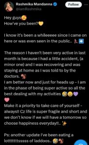 રશ્મિકા મંદાનાએ તેની પોસ્ટમાં હસતા ઇમોજીને આગળ લખ્યું, “હવે હું ઠીક છું અને હું તમને એક વાત કહું કે હવે હું સુપર એક્ટિવ બની રહી છું તેથી મારી પ્રવૃત્તિઓ માટે સર્વશ્રેષ્ઠ. વધુમાં, રશ્મિકાએ તેના ચાહકોને એક સંદેશ આપ્યો છે અને લખ્યું છે કે તમારી સંભાળ રાખવાને તમારી સૌથી મોટી પ્રાથમિકતા બનાવો. કારણ કે જીવન ખૂબ જ નાજુક અને ટૂંકું છે અને આપણે જાણતા નથી કે આપણને આવતીકાલ જોવાનો મોકો મળશે કે નહીં, તેથી દરરોજ ખુશી પસંદ કરવાની ટેવ પાડો.