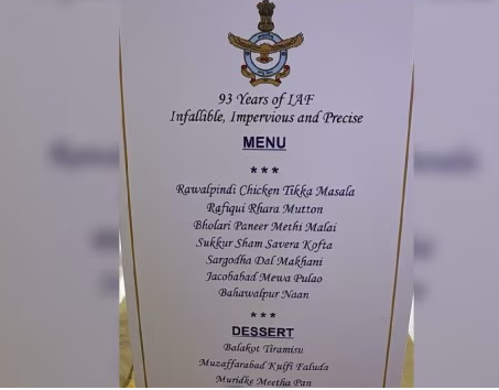 ભારતીય વાયુસેના (IAF)એ 8 ઓક્ટોબરે ખૂબ જ ધામધૂમથી તેની 93મી વર્ષગાંઠની ઉજવણી કરી. જોકે, વાયુસેના દિવસની ડિનર પાર્ટીનું મેનુ સોશિયલ મીડિયા પર છવાઈ ગયું.કારણ સ્વાદ નહીં, પણ તેમાં શામેલ વાનગીઓના નામ છે. મેનુનું શીર્ષક “93 વર્ષ IAF: અચૂક, અભેદ્ય અને સચોટ” છે.મેનુપરની વાનગીઓના નામ પાકિસ્તાની બેઝ પરથી રાખવામાં આવ્યા છે.