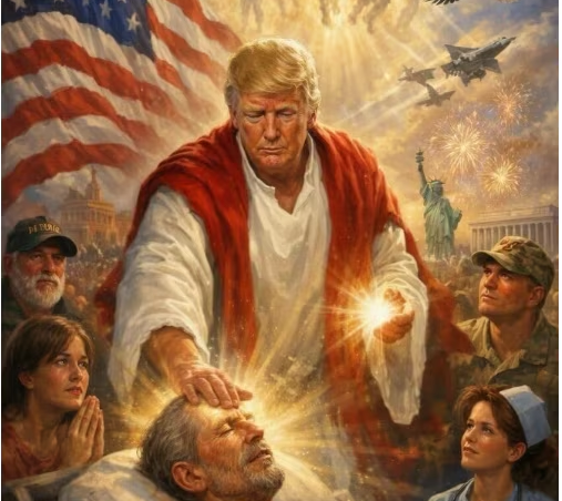 આર્ટિફિશિયલ ઇન્ટેલિજન્સ દ્વારા તૈયાર કરાયેલી આ તસવીરમાં ડોનાલ્ડ ટ્રમ્પ એક બીમાર વ્યક્તિ પર હાથ મૂકીને તેને સાજો કરતા દેખાય છે.આ દ્રશ્ય બાઈબલમાં વર્ણવાયેલા ઈસુ ખ્રિસ્તના પવિત્ર ચમત્કારોની સીધી નકલ સમાન છે.તસવીરની પૃષ્ઠભૂમિમાં અમેરિકન ધ્વજ અને સૈન્ય વિમાનો પણ જોવા મળે છે.જે ટ્રમ્પની ‘તારણહાર’ (Messiah) અને ‘રાષ્ટ્રવાદી’ છબીને એકસાથે રજૂ કરવાનો પ્રયાસ હોવાનું મનાય છે.